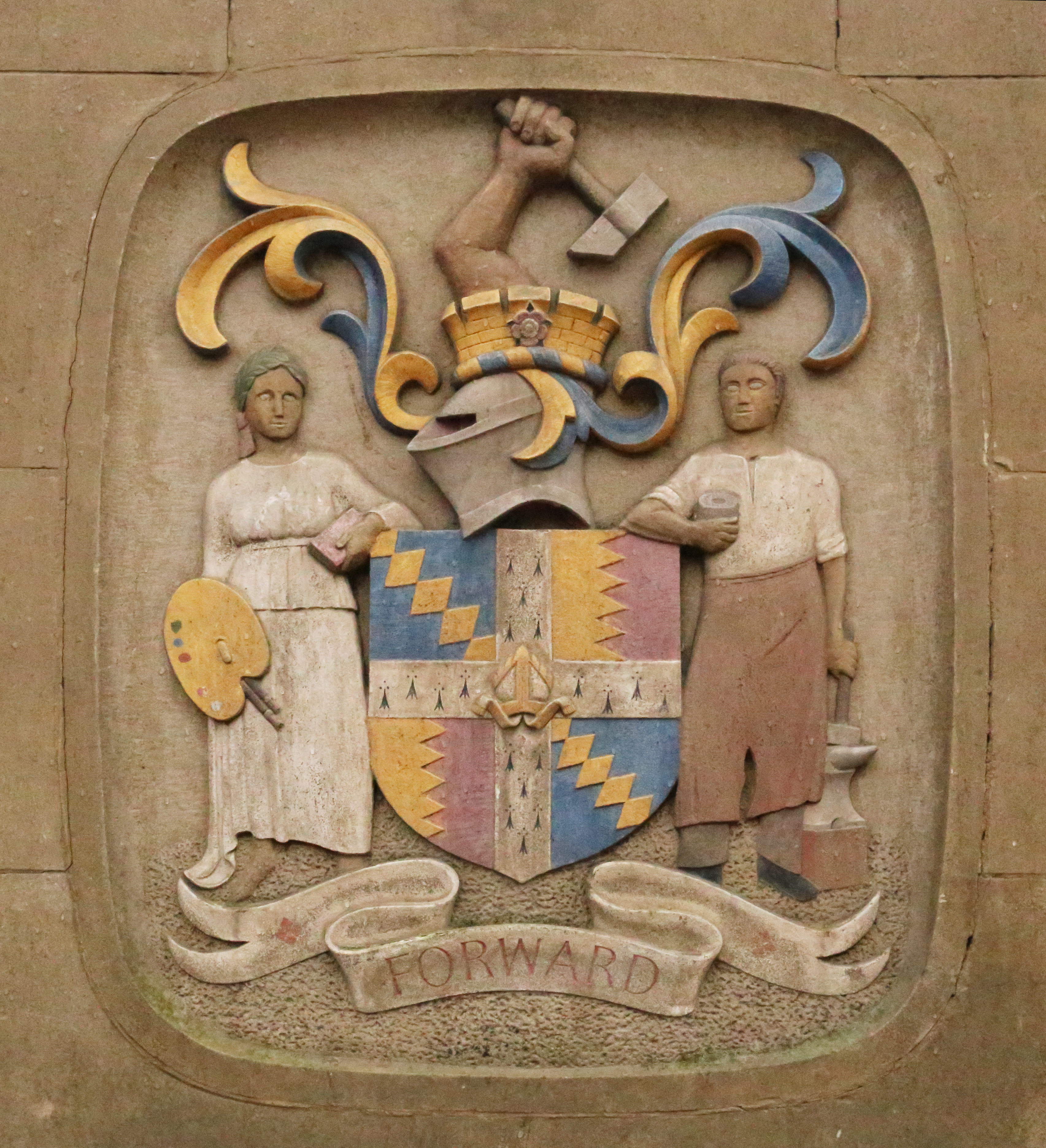 Polychrome sandstone coat of arms of Birmingham with the motto 'Forward'; made in 1992