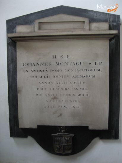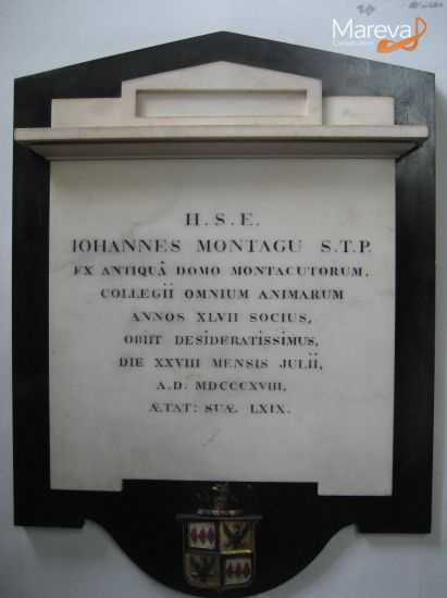 White marble tablet on a black ‘marble’ slab; 1818; engraved inscription painted in black; polychrome coat of arms; 15th C. ante-chapel; All Souls College